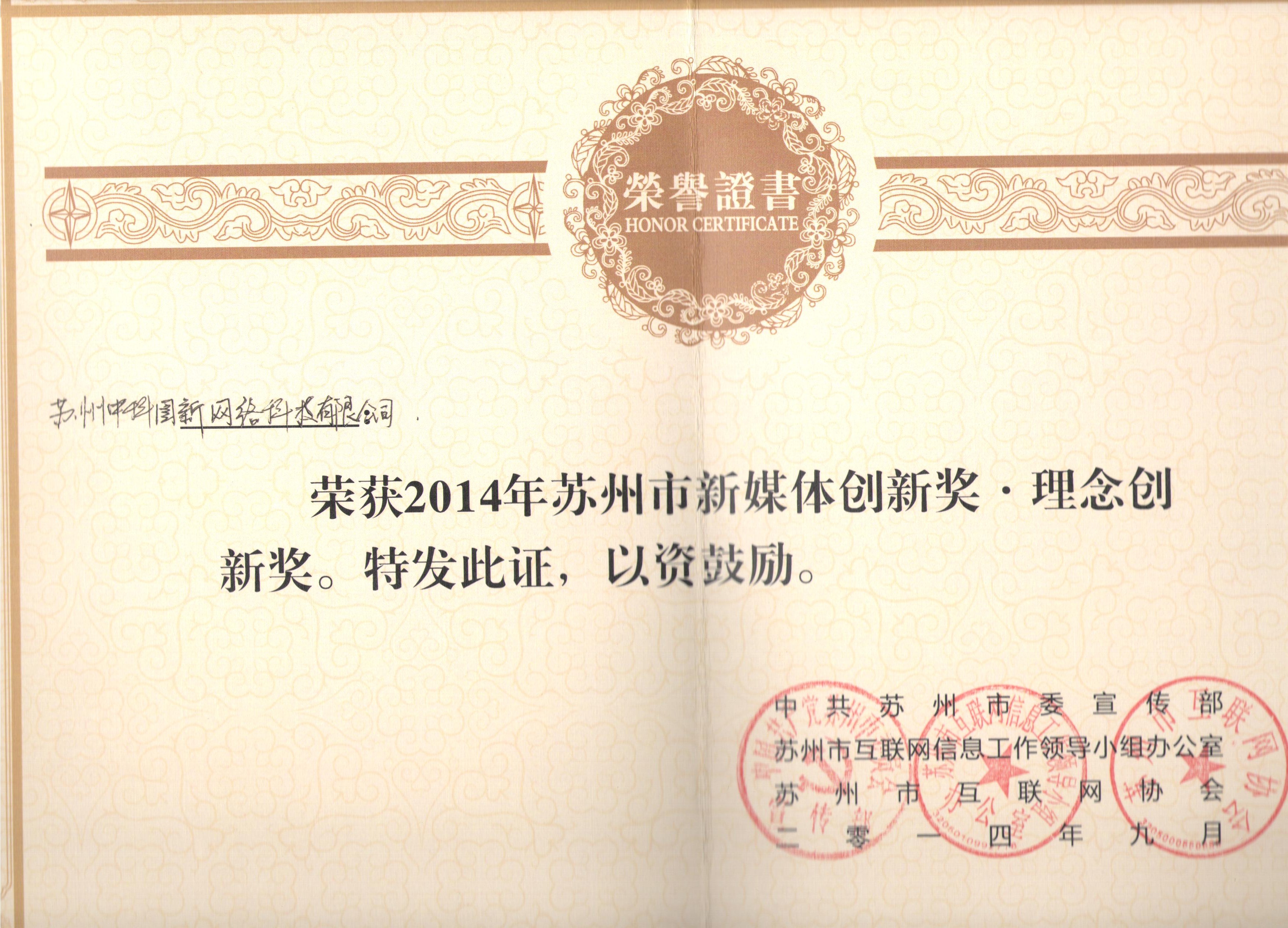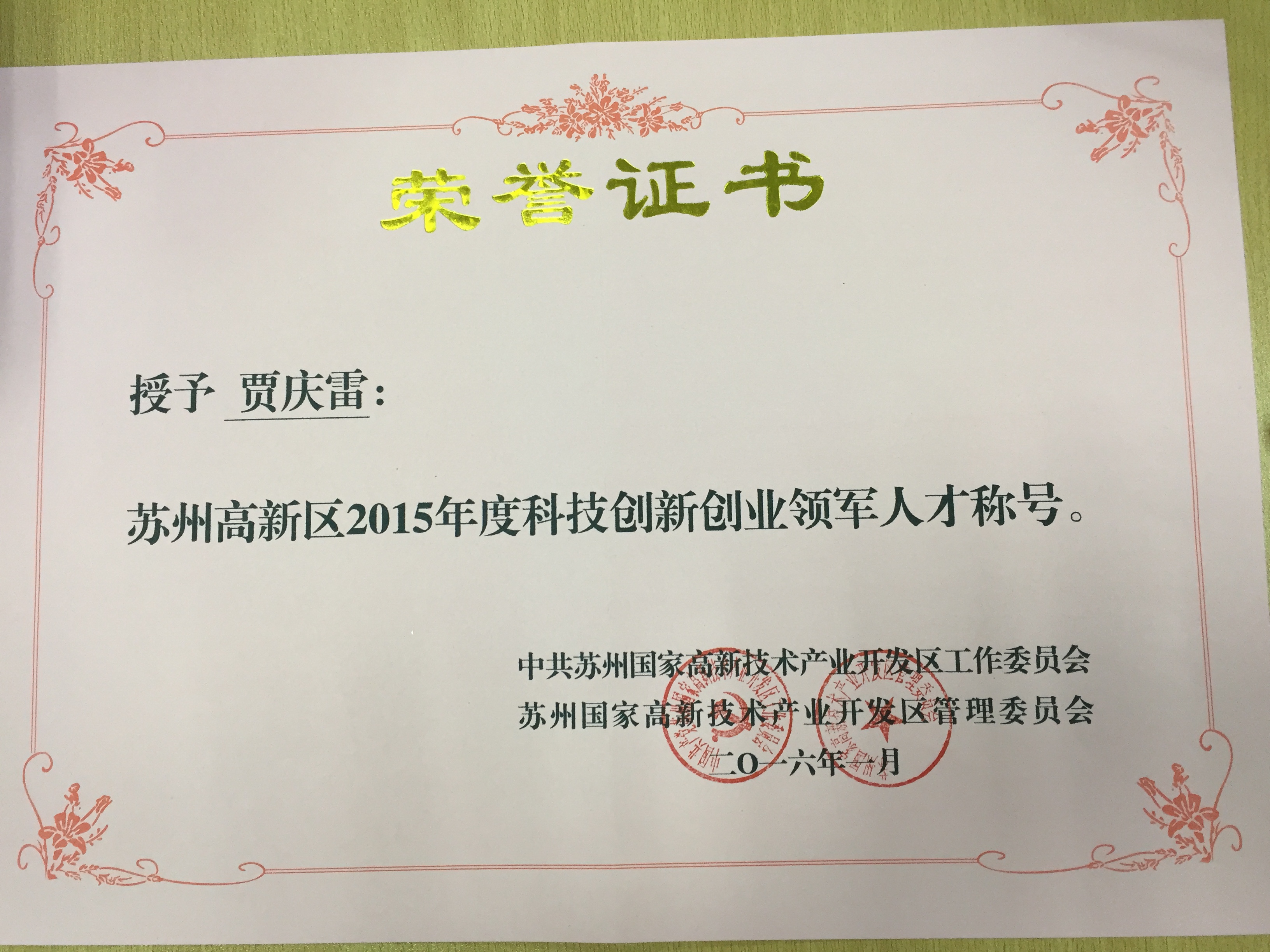 因在网络环境下多系统GIS三维数字交互平台的构建技术方面的成就,故授予创始人“苏州高新区2015年度科技创新创业领军人才”称号。